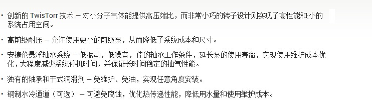 TwisTorr 84 FS 高真空渦輪分子泵采用 TwisTorr 拖動技術和安捷倫懸浮軸承,具有高性能、高可靠性及經濟性。TwisTorr 技術對小分子氣體(如氫氣和氦氣)能提供高壓縮比,從而實現大抽氣量和高前級耐壓,進而能使用更經濟實惠、更小型的前級泵。該技術使得轉子能采用緊湊的設計,變得節能,并能保持較低的工作溫度。安捷倫懸浮軸承系統降低了噪音和振動,并能保證軸承工作條件,從而能延長工作壽命,大程度減少系統停機時間,并能確保長時間穩定性。TwisTorr 84 FS 泵有的軸承和干式