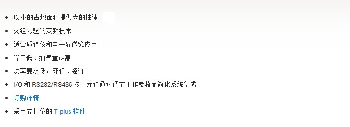 安捷倫 MS40+ 環保型旋片泵是由真空技術專家設計的最新產品。該泵的抽速超過 45m3/h,是同類產品中最高的。尖端的電子器件和優秀的機械設計使得該泵占地面積小,粗抽大。MS40+ 泵通常用于電子顯微鏡和質譜儀應用,其中包括 LC-MS/ICP-MS/GC-TOF-MS 和其他科研儀器。