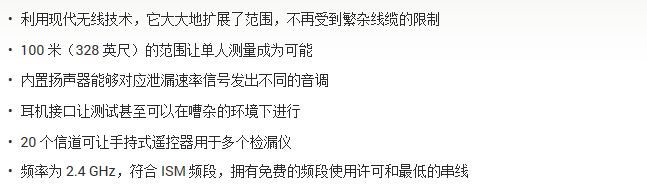 在大型系統中,泄漏點往往遠離檢漏儀。利用現代無線技術,對之前難以觸及位置的泄漏檢測變得容易了許多,并且可以在更遠的(長達 100m )的位置完成。除了可視的泄漏速率顯示條以外,遠程控制還帶有揚聲器,能提供不同音調的音響指示泄漏趨勢及泄漏點的相對大小。檢漏儀的所有主要功能都只需您輕啟手指,為您帶來真正的便攜式檢漏解決方案。