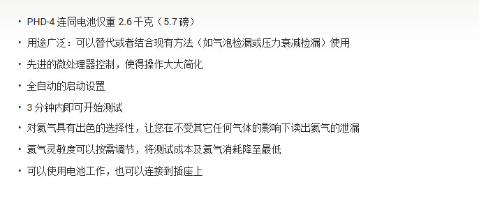 即使物體內(nèi)部只有很低的氦氣/空氣氣壓,PHD-4 也能檢測出其中的極小泄漏。PHD-4 對氦濃度十分敏感,能夠檢測出濃度低至 2 ppm 的氦氣,相當(dāng)于 5 x 10-6 atm-cc/s 泄漏速率,遠(yuǎn)優(yōu)于其他檢漏方法(如氣泡檢漏)。PHD-4 的靈敏度依賴于安捷倫獨(dú)有并已獲專利的 SIPD(選擇性離子泵檢測)技術(shù)。PHD-4 由微處理器控制,無需培訓(xùn)即可輕松使用。所有的調(diào)諧和歸零都可自動完成。其顯示器可設(shè)置采用下列四種語言:英語、法語、德語和意大利語。